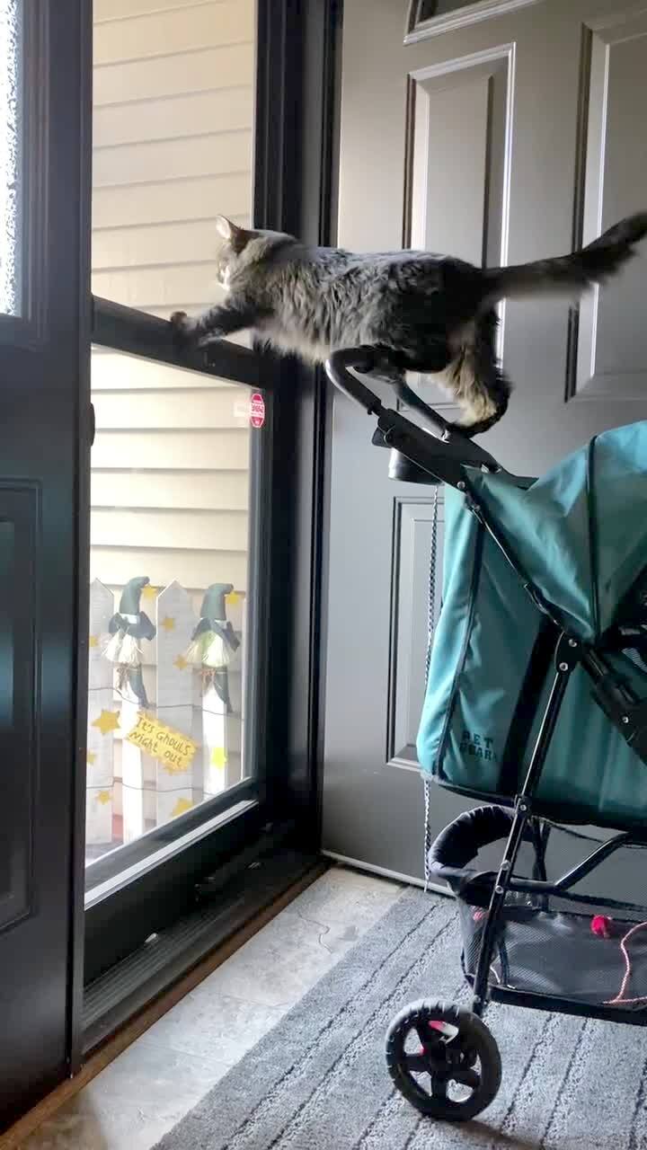 A cat stands on the handle bar of a baby stroller and reaches for the screen door handle and the stroller rolls away and the cat falls in the entryway.