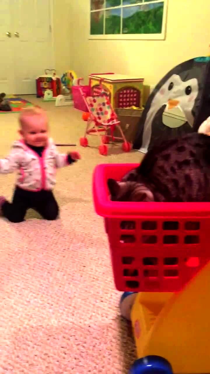 A female toddler pushes a toy cart with a cat in the basket. The baby pushes the cat until the cart falls forward.