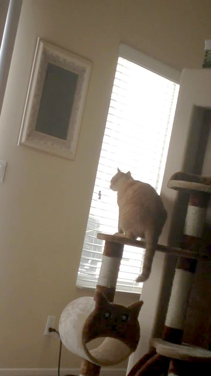 A kitten cat watches a moth fly next to a patio door, then it jumps out of a pet tower at the bug and falls.