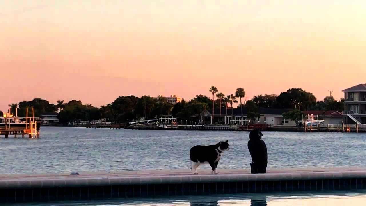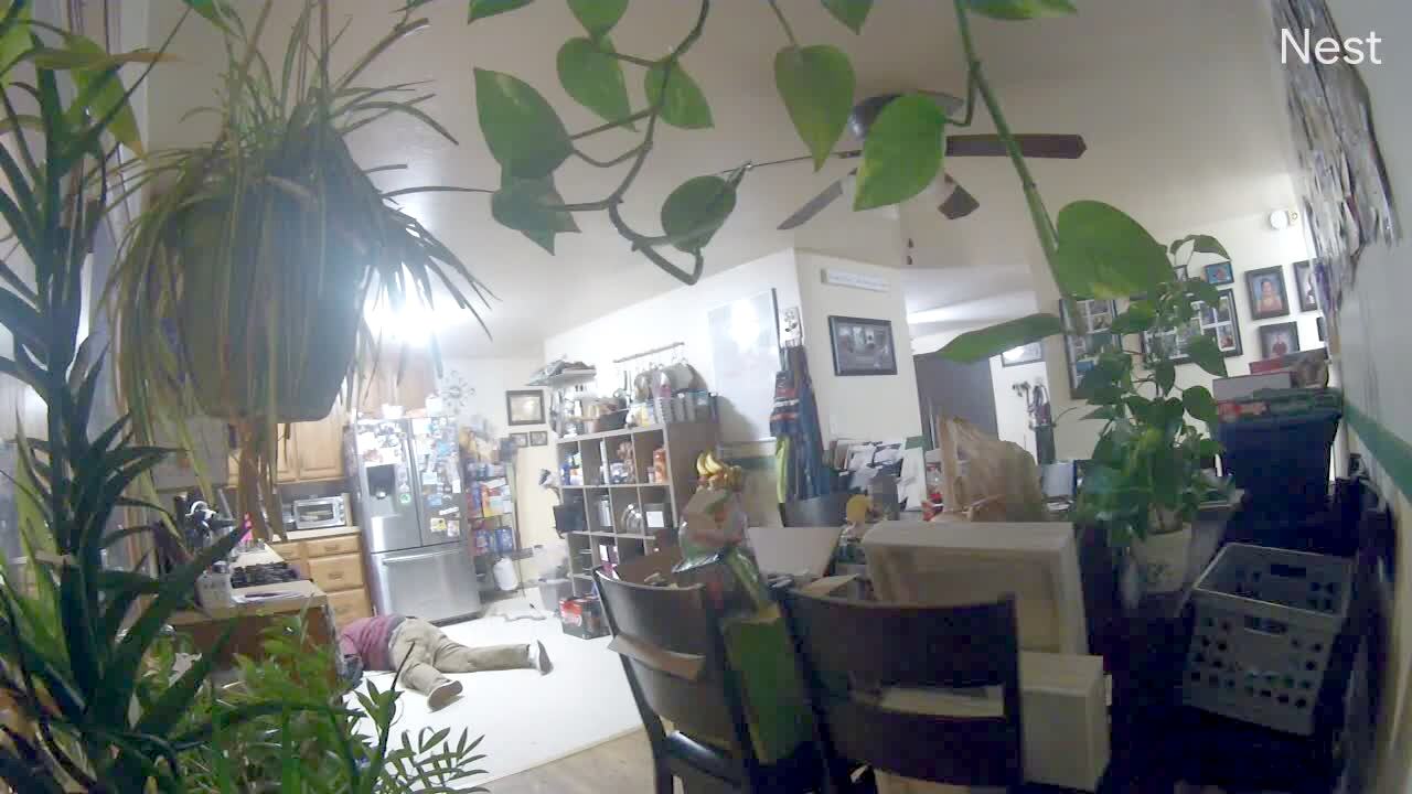 A man trips over a cat and falls in a kitchen, his teen daughter goes to tell her mother on the patio who walks into the house and curses. Home security footage.