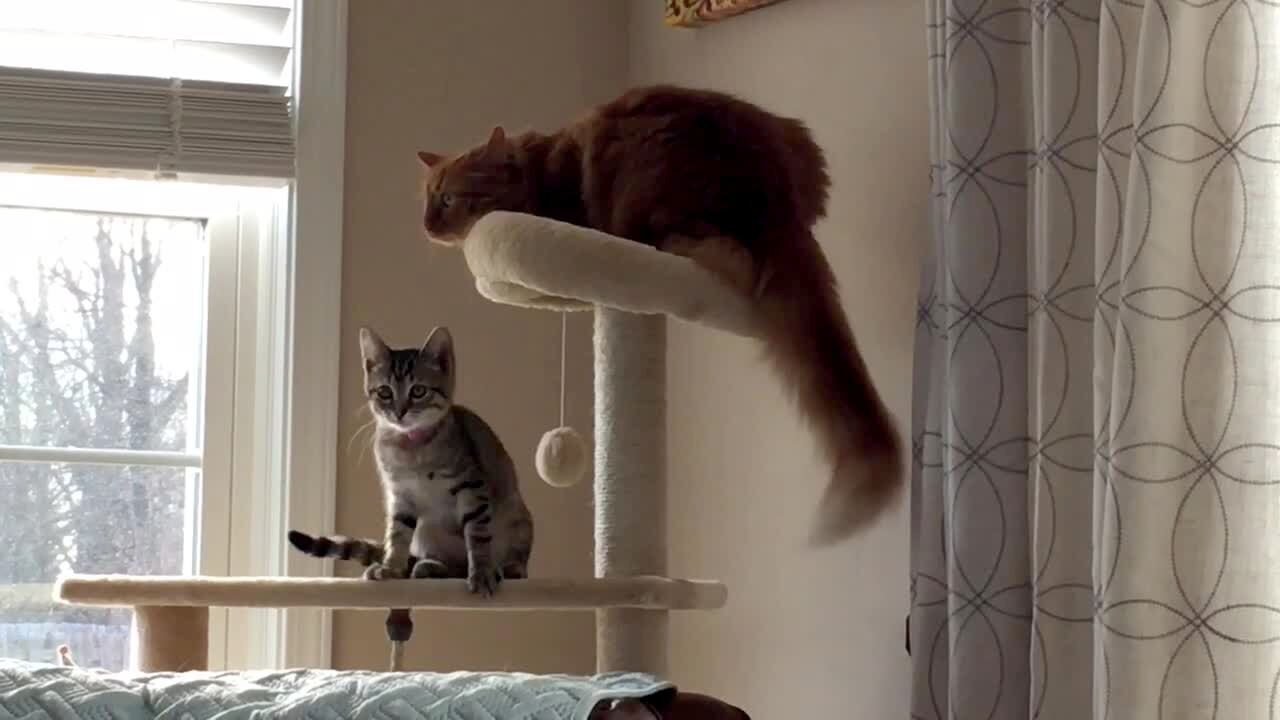 A cat sits on top of a scratching post and dangles its tail. Another cat swipes at the tail and falls off while reaching for it at the end.