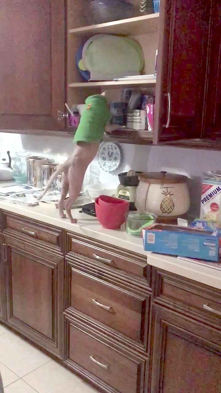 A cat dives from one table to another but misses and crashes onto the kitchen floor instead.
