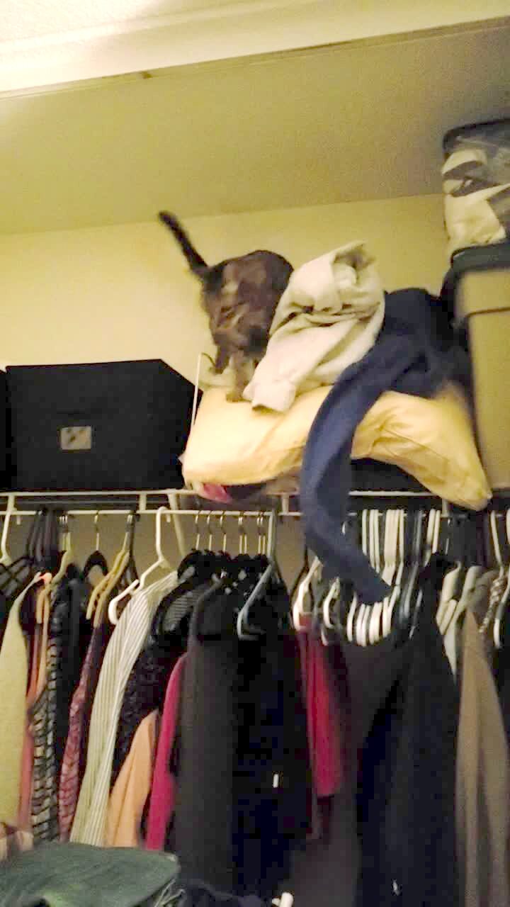 A cat walks on a closet shelf until they fall out when a stack of clothes tip over.