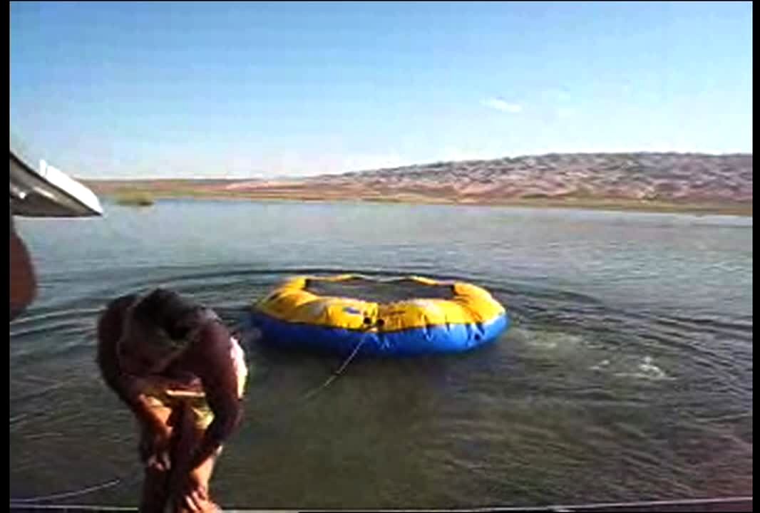Two men jump onto a large inflatable raft and bounce / launch a boy into the lake. He cries. Short heads