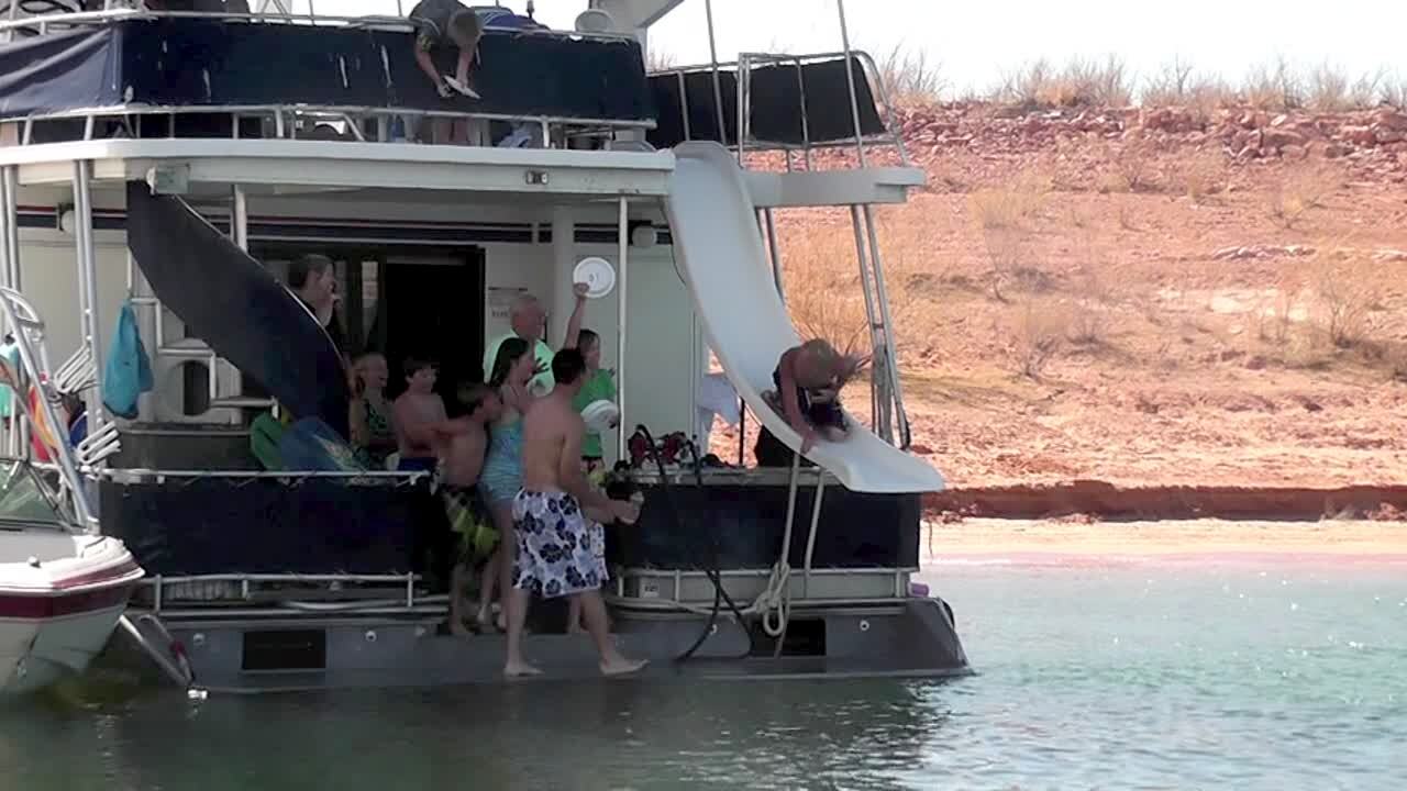 Several kids and adults stand on a house boat. A man tries to slide down a slide off the top of the boat on his stomach. His skin is too dry and he painfully stops halfway down the slide. Then he jumps into the water as everyone laughs at him.