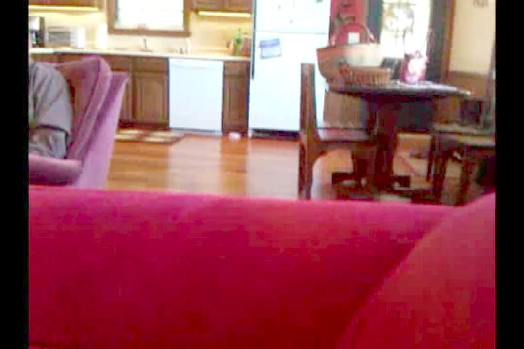 A cat runs over a couch and jumps into a fish tank in a living room. A man pulls the cat out of the tank.