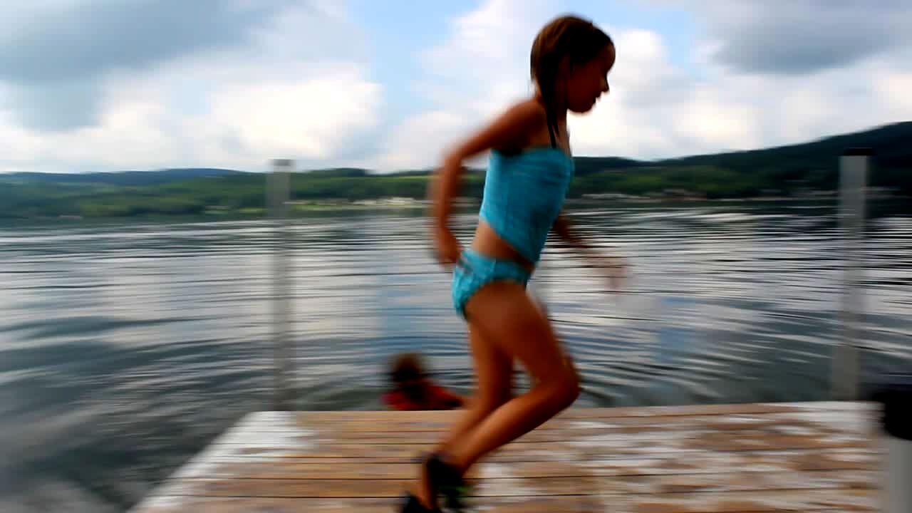 A young girl says "Tom Bergeron," jumps off of a dock, and into a lake outdoors. Introduction. Daisy Meyer, age 9 (Day-zee My-err)
