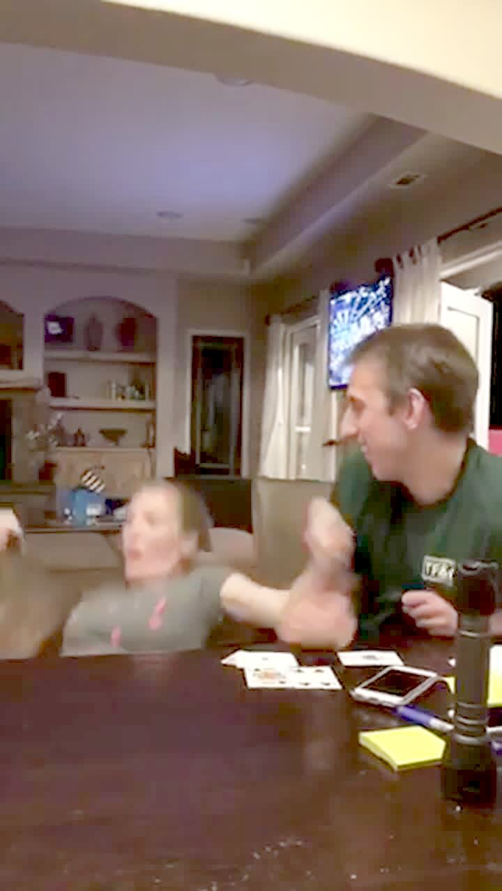 A man and woman flip over playing cards at the same time, and the woman cheers but falls off of her chair.