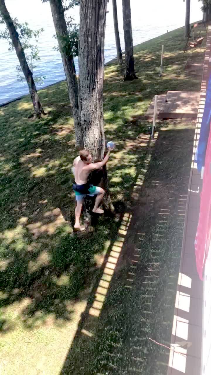 A man shoots a basketball at an inflatable basketball hoop in a yard and misses. Another man with the camera says "I've never seen so many misses". The man grabs a ball and throws it over his head and it goes in. Featured talent cleared only (boy and man without a shirt on).