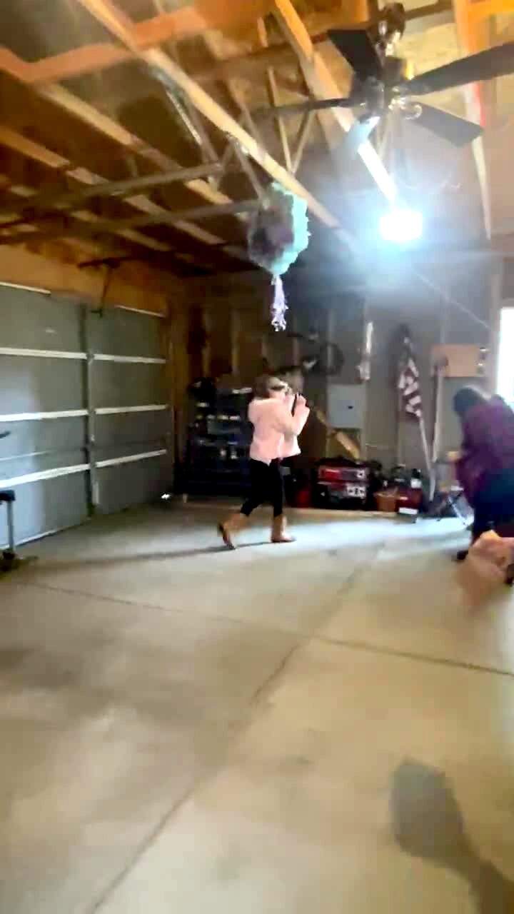 A young girl tries to swing at a pi�ata in the garage, and throws the bat that hits a young boy in the groin.