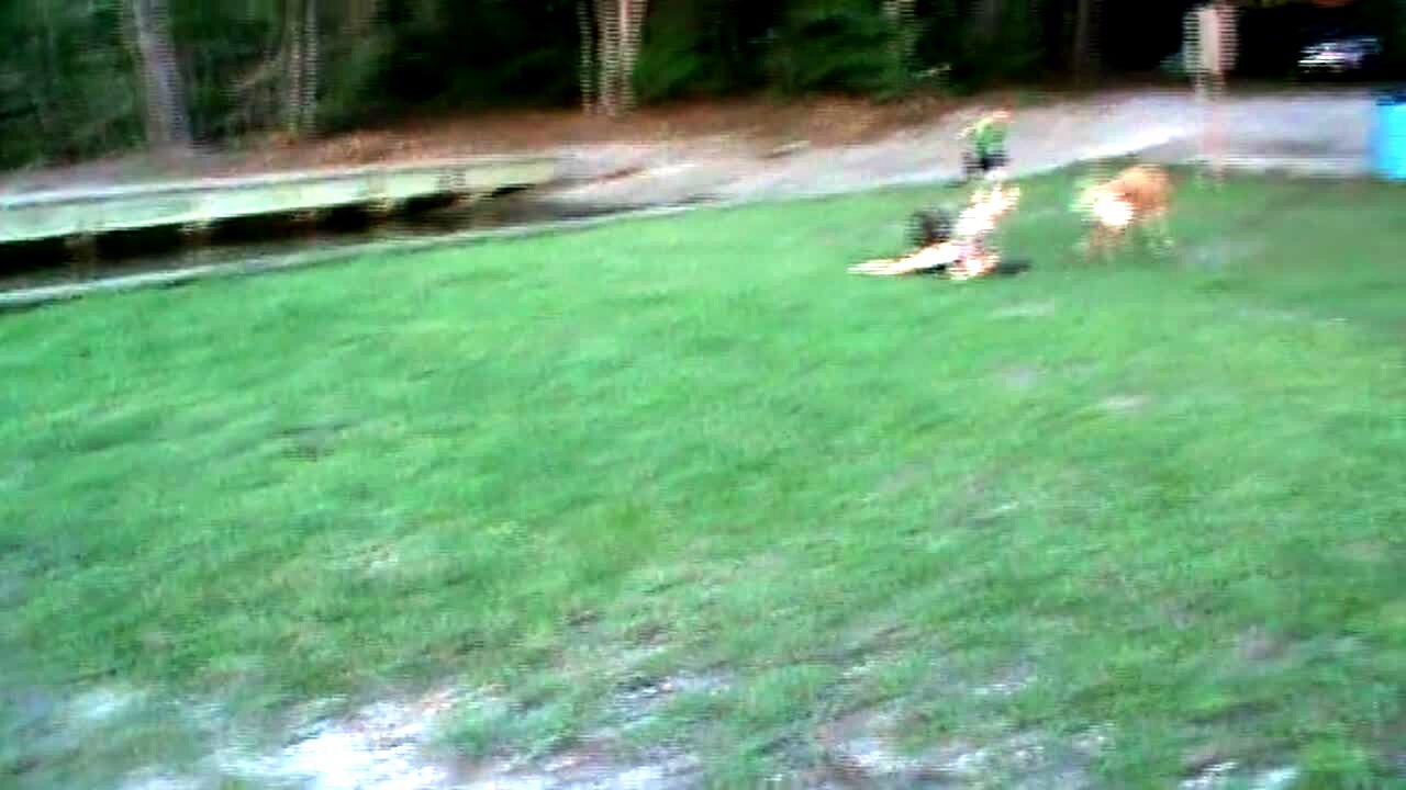 Two German Shepherd dogs watch a drone toy fly and one dog jumps and bites it and a woman screams in a living room.