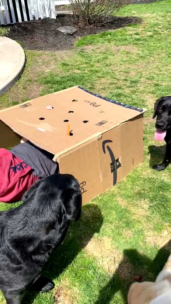 A woman lays under a cardboard box with holes in it and sticks an object through the holes. Her dogs play with it until one jumps on the box.