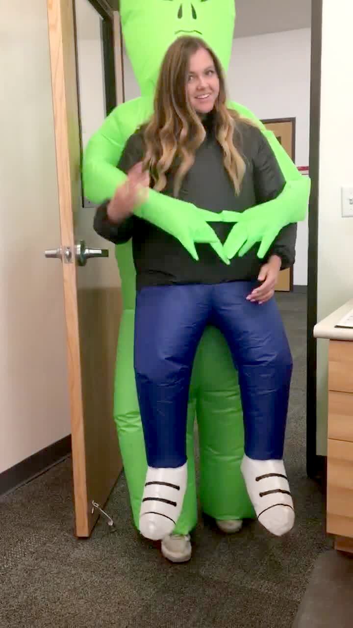 A young woman in an alien costume at work pretends that the costume is real. She mimics and alien as it pulls her away.