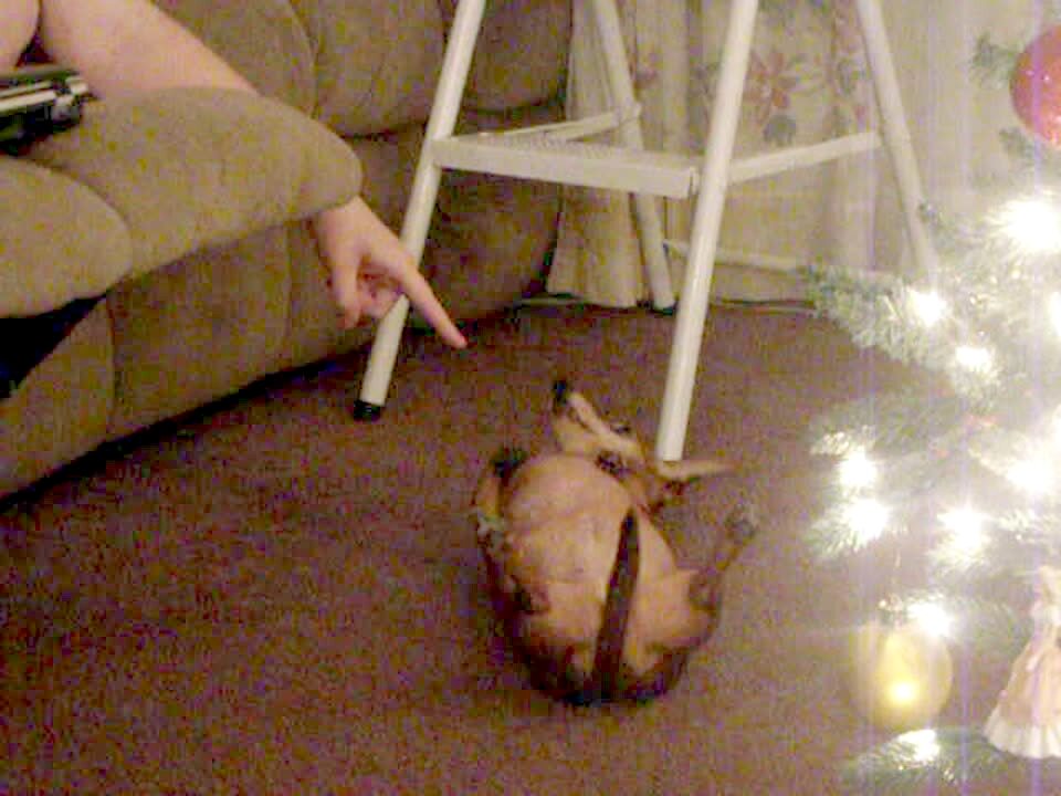 Chihuahua dog lays on its back on the living room floor and stops wagging its tail on command.