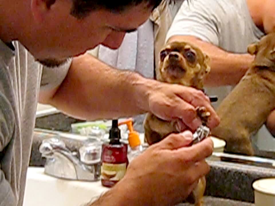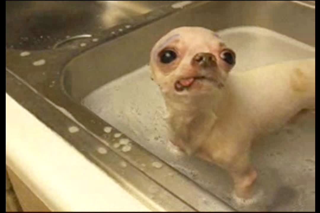 Chihuahua dog gets a bath in the sink, it makes weird noises and sticks its tongue out of its mouth. Odd face.