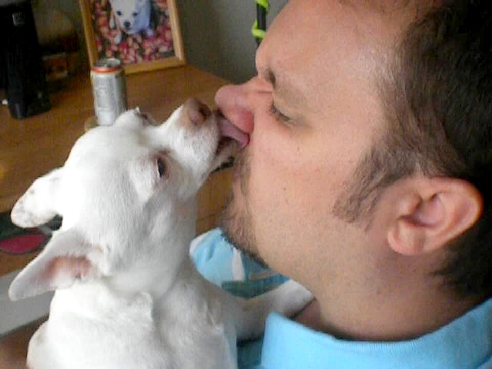 Chihuahua dog sitting on owner's lap in the living room licks the inside of man's nose. Gross.