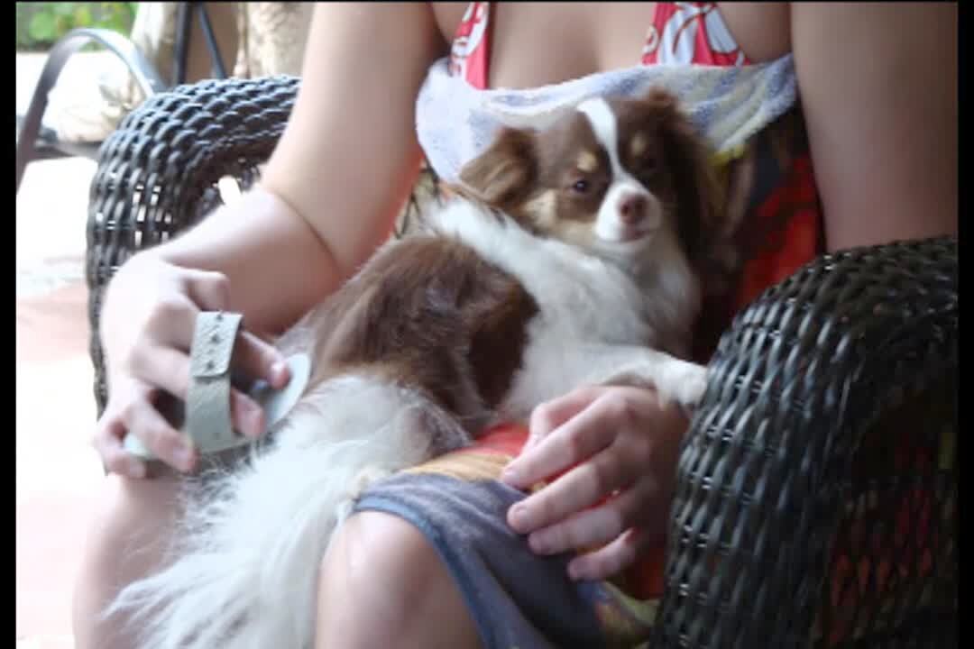 Brown & white chihuahua shakes its body when getting brushed. Woman holds him on her lap. Dogs.