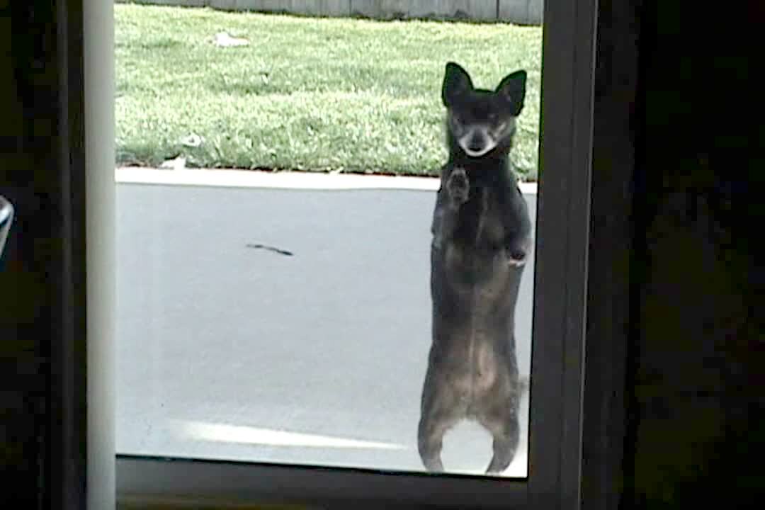 Dog stands on back paws at door and appears to be dancing to salsa music. Montage maybe.