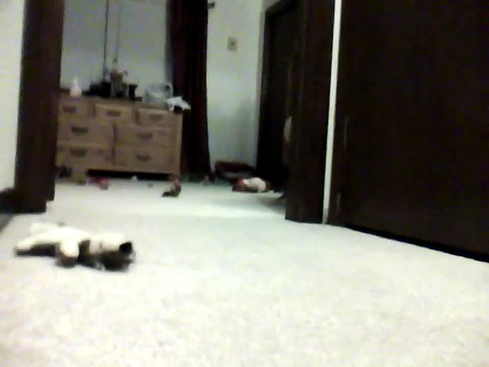 A chihuahua dog flings the bottom half of his body left and right repeatedly indoors.