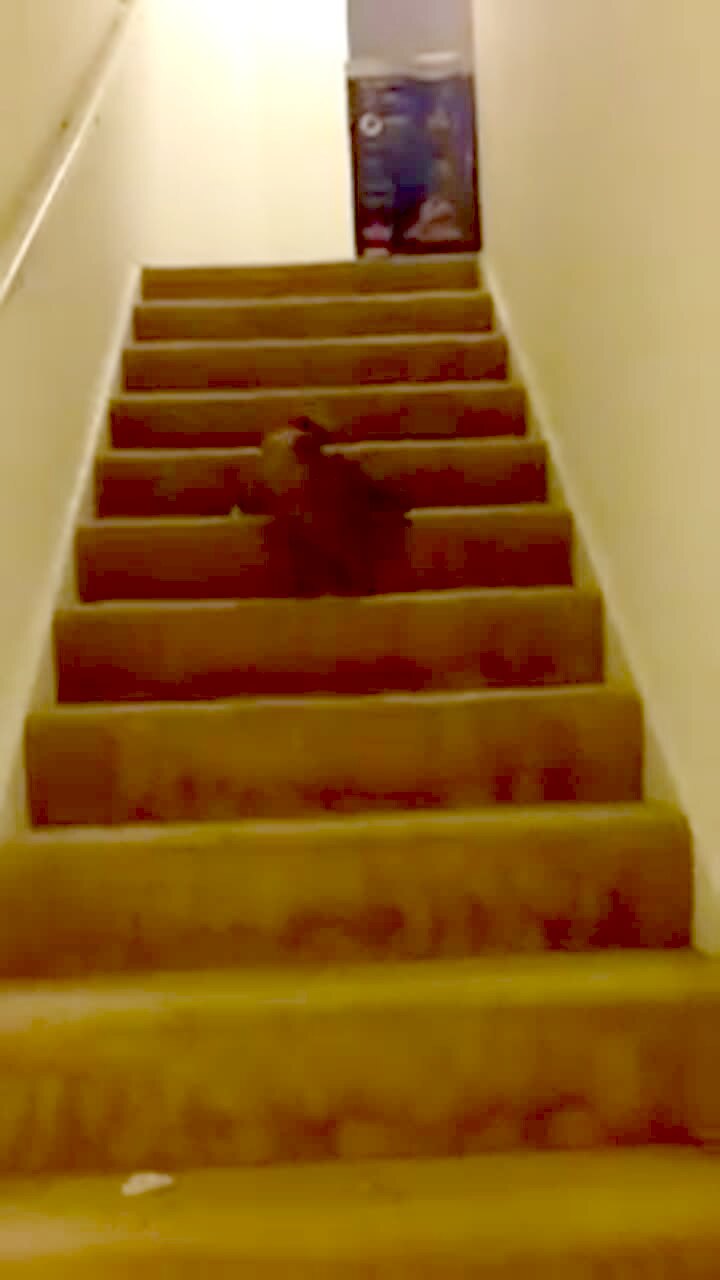 A chihuahua dog spins in circles as he goes down stairs indoors.