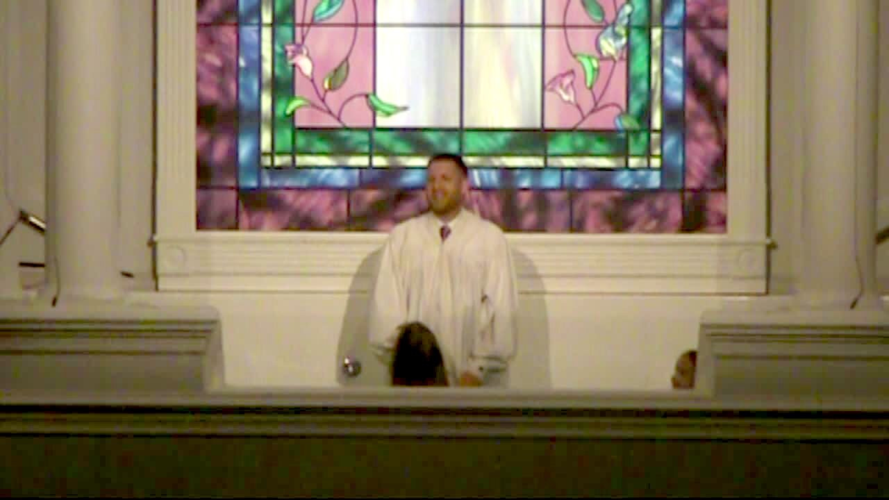 A preacher man baptizes a boy in a church by dunking him into a baptism fountain. A cross falls off the wall into the baptism fountain.