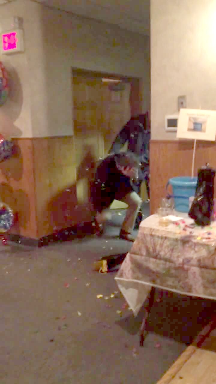 A man walks into a surprise retirement party and when his friends yell to surprise him, someone pulls a confetti gun near his face and he drops to the floor with his hands over his ears.