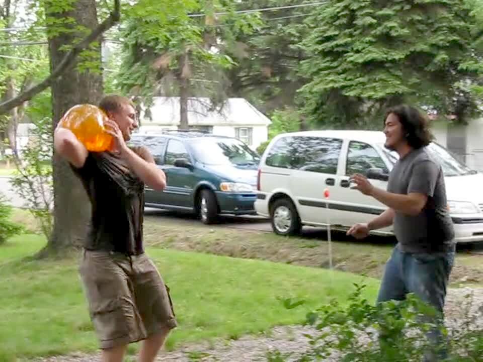 In a front yard, a man is about to throw a large water balloon onto another man. The balloon explodes and soaks the first man. prank Backfires.