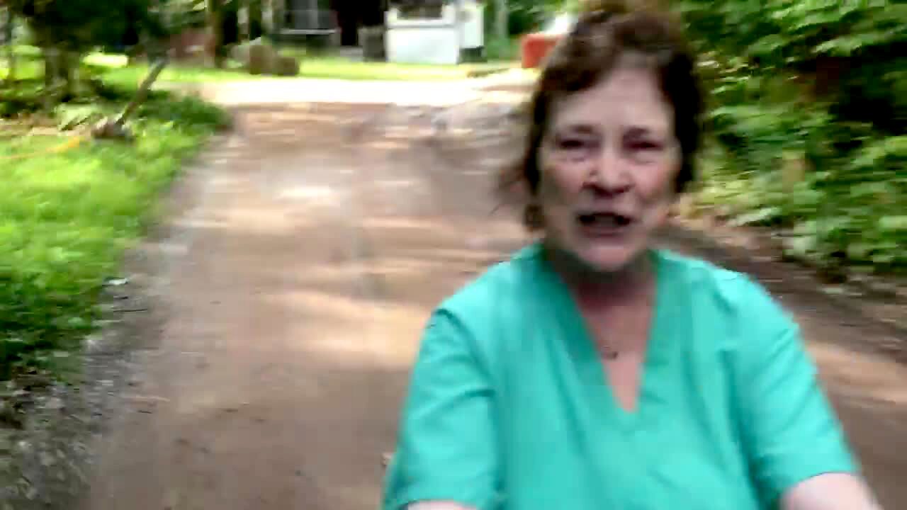 A woman jumps rope on the back patio and hits a string of lights overhead. The lights fling into the ceiling fan and get tangled up and several bulbs break.