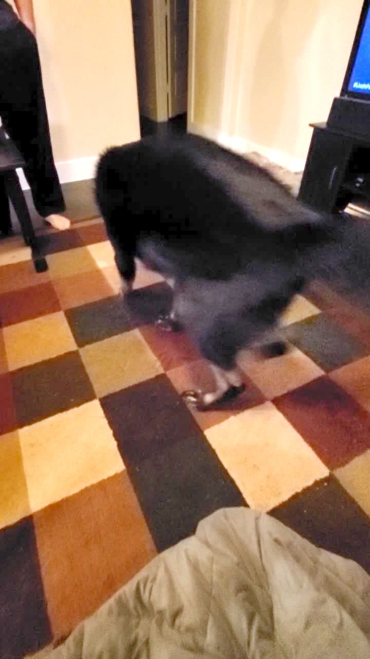 Man wearing Santa hat tries to do handstand on arms of easy chair, flips over and falls to floor. Bonehead. Christmas.