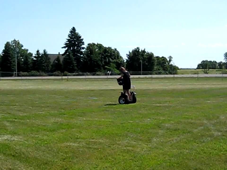 Woman rides a Segway through the grass. She leans too far forward & falls off. No recovery.