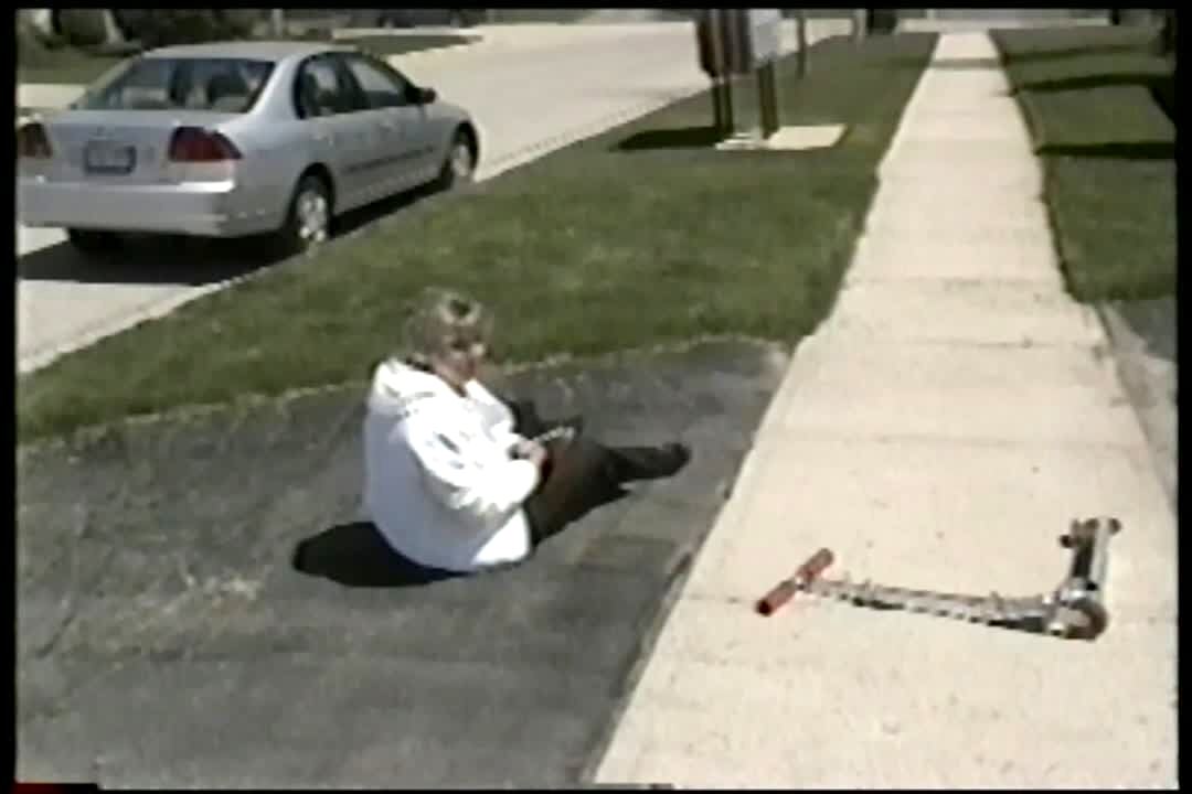 A woman crashes a Segway scooter onto a curb outdoors, steps down, it spins around her and she falls over. She asks the man who owns it if it took him a long time to figure it out when he got on it and he says "no."