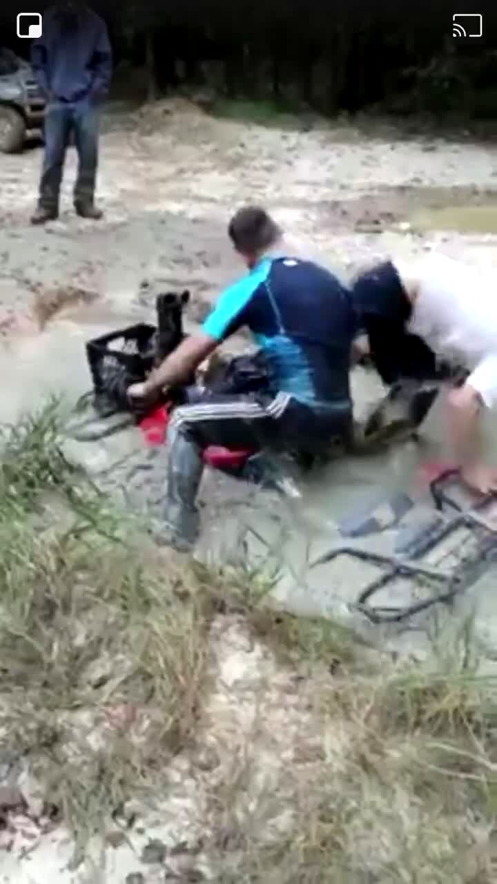 A man climbs out of an above-ground pool, but the ladder breaks and he falls on the grass. Security footage.