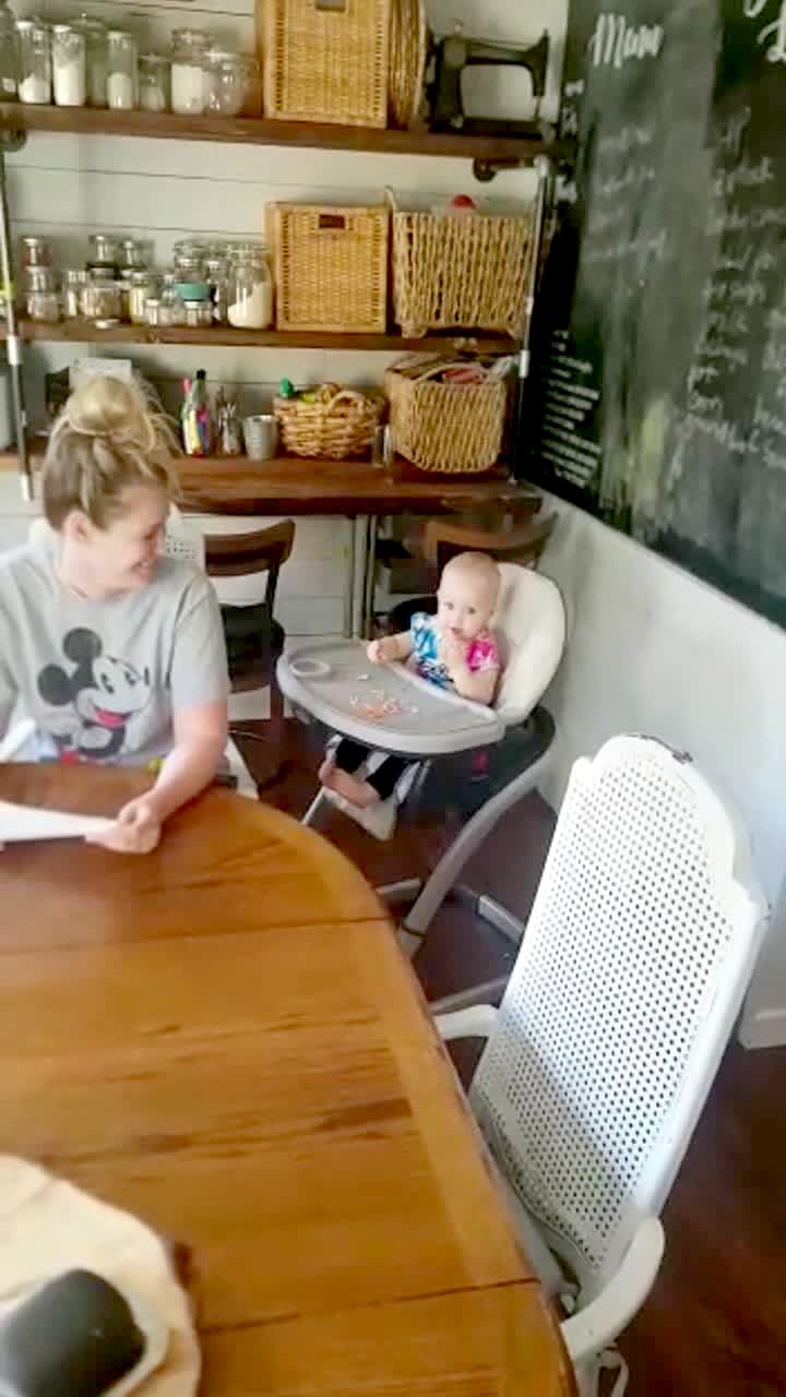 A woman in a restaurant pretends to pull money and a credit card from behind a young girl's ear and the girl looks surprised and says she doesn't know where it came from.