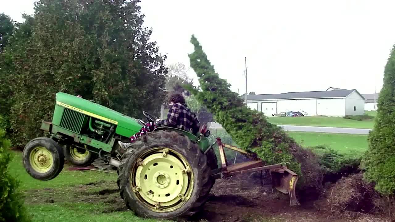 A man drives back and forth with a tractor, trying to pull 2 trees out of the ground and the trees keep smacking him in the head. Finally, he pulls the trees out and drives off. Short heads. Short tails.