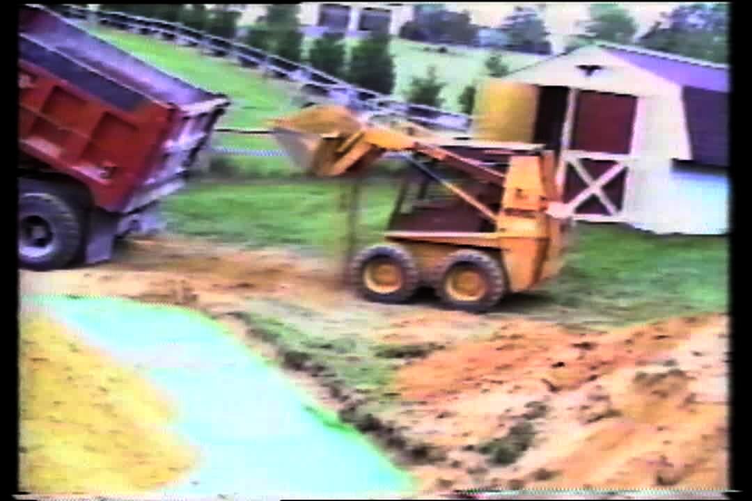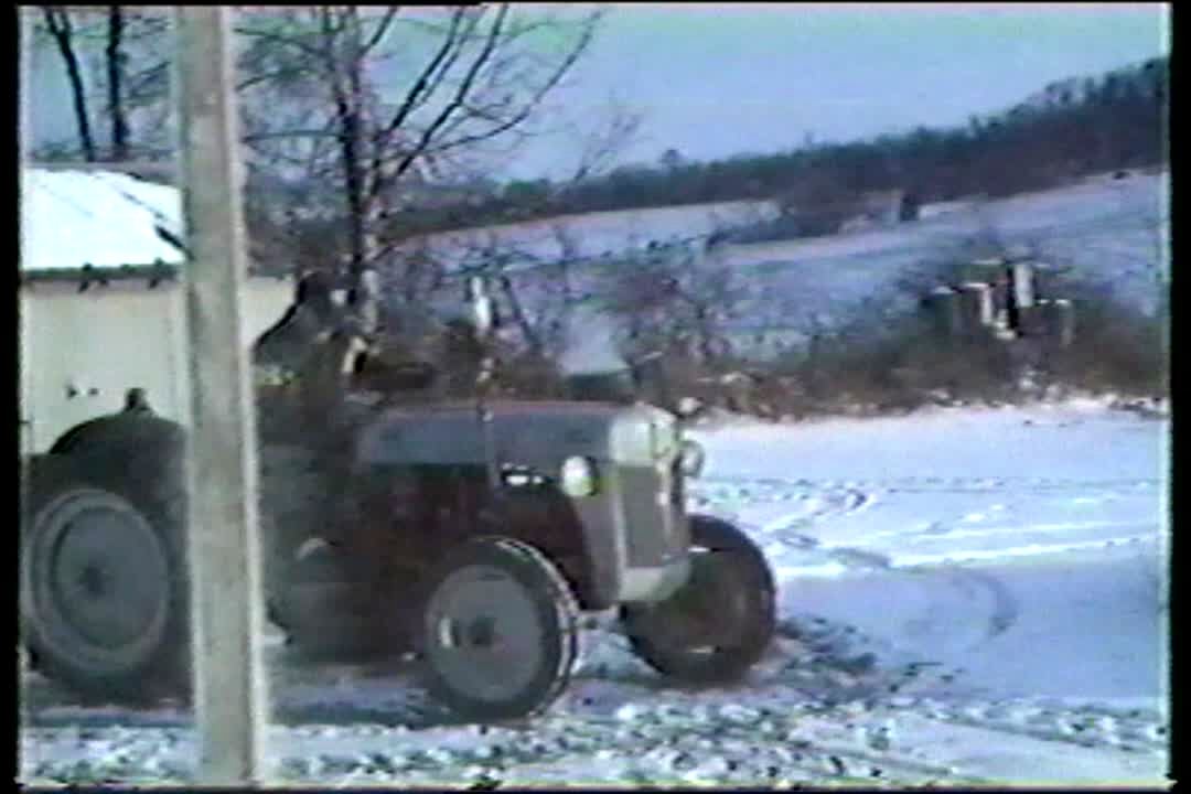 A man on a farm tries to load a tractor onto a trailer, but the brakes let loose and the truck and trailer roll down a hill into some trees. The man jumps off and tries to catch up to the truck but falls.