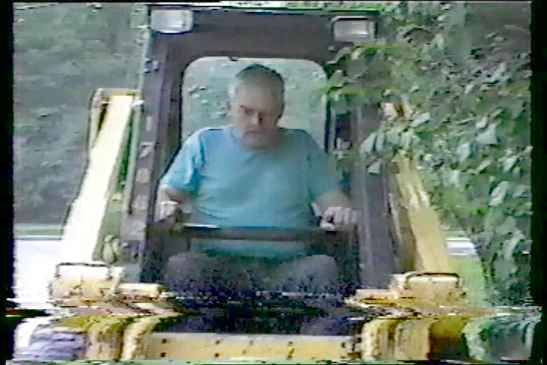 A man on a tractor tries to unload his tractor off a trailer. He flips backwards onto the front yard and says, "That's something you watch on TV." before he continues to back up the tractor. Security Footage.
