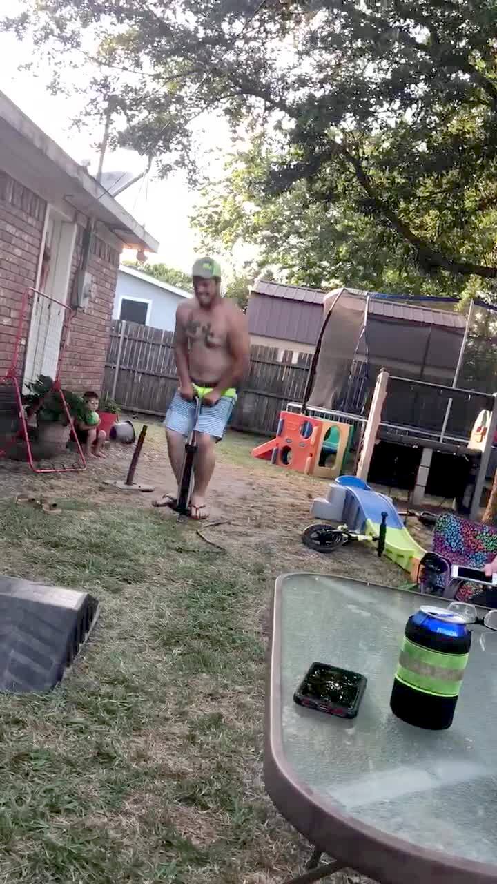A teen boy hits his groin on a scooter when he lands on its handlebars after he does a backflip off of a zipline at a playground park.