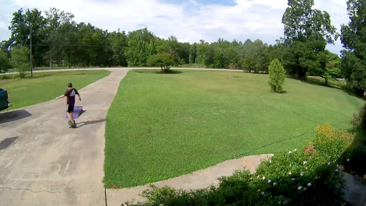 A man falls out of the front of the house and stumbles into the bushes. Home security footage.