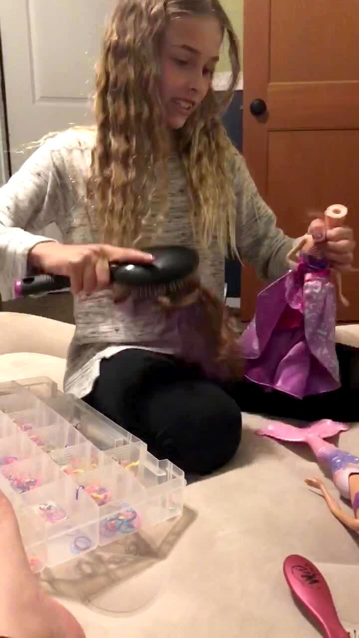 A young girl breaks off her doll's head when she brushes its hair in the bedroom.