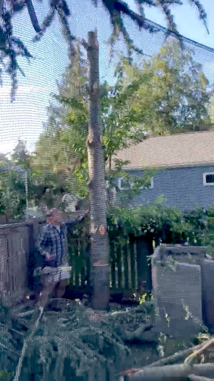 A man accidentally breaks a trampoline in the backyard when he pushes over a tree after he cuts it with a chainsaw and it lands on the trampoline.
