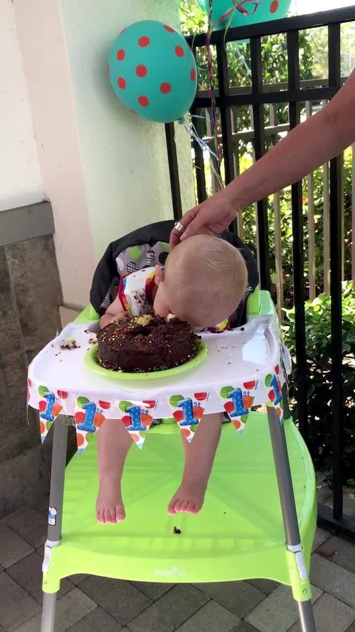 A baby boy in a high chair falls asleep with his face in his birthday cake.