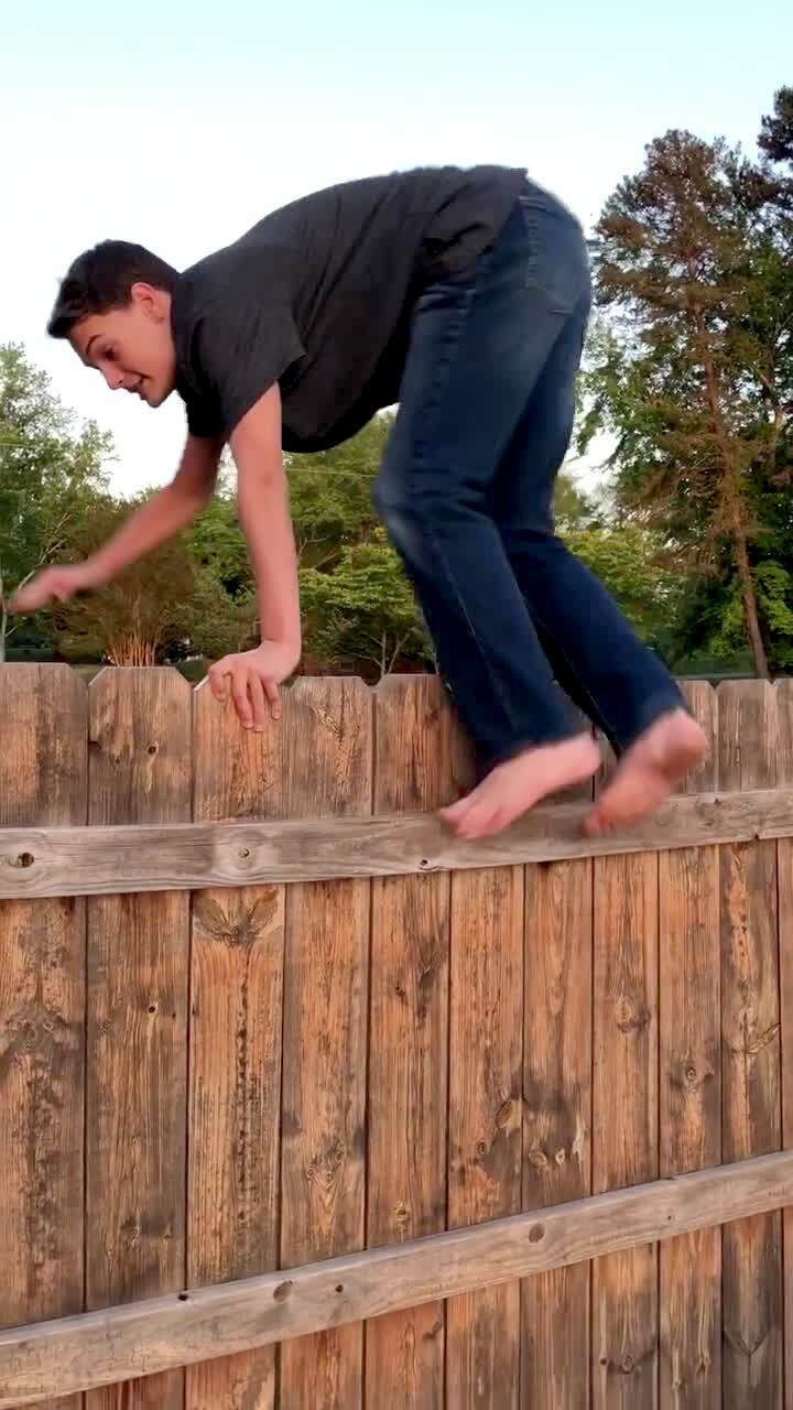 A young boy says "Gotta Blast" right before he falls off of a fence.