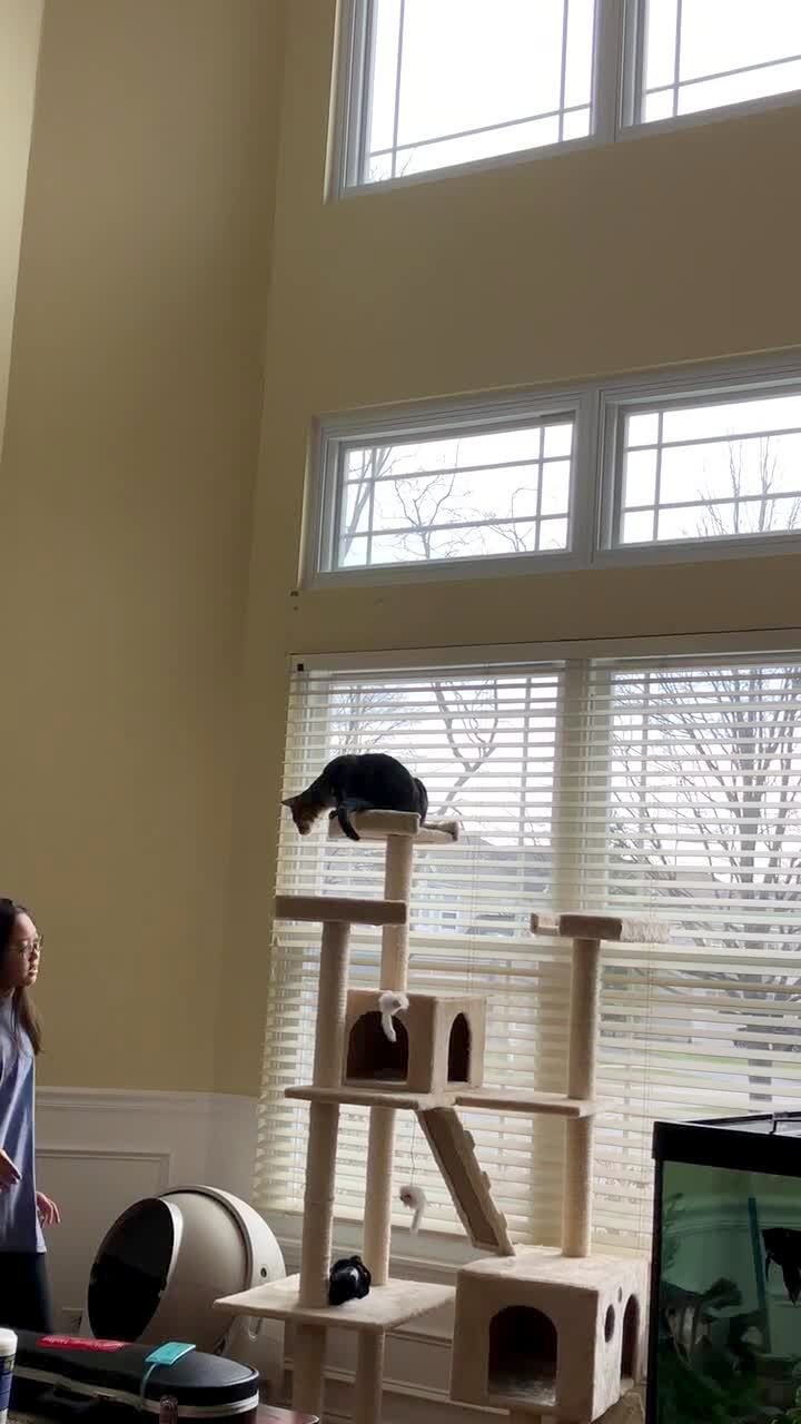 A cat jumps off of a tall cat tower towards the blinds in the living room window and falls.