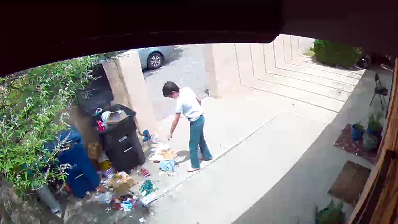 A young boy drags a bag of trash to a garbage bin in his yard, it breaks and spills everywhere as he lifts it, then he leaves the mess and walks back inside. Security footage.