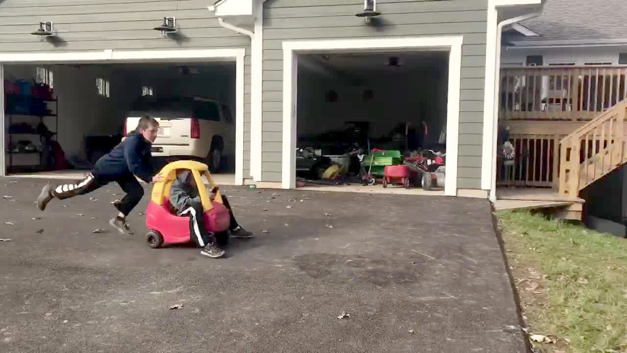 A young boy sits in a fisher price car while a young boy pushes him down the driveway and a hill. The car crashes into a tree and the boy falls.