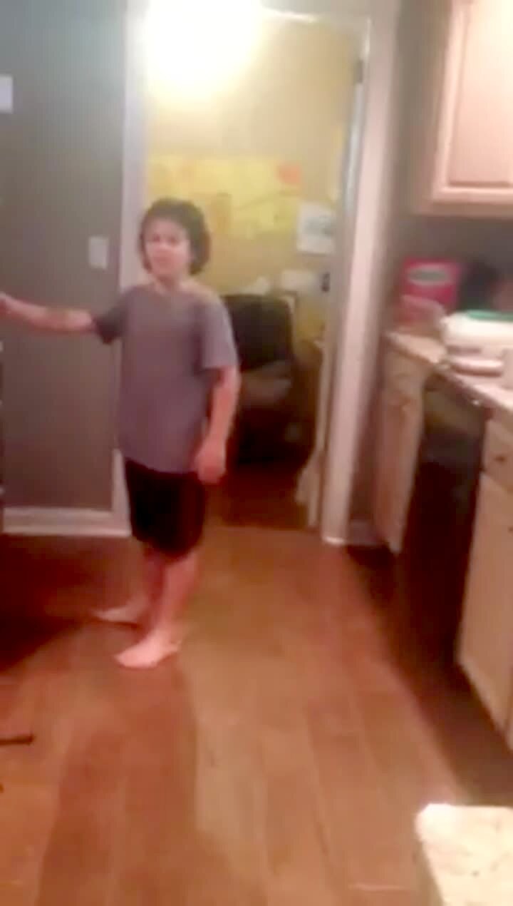 A boy walks indoors, opens a refrigerator door, and has a cooking tin of water fall on him. A woman is audible. Practical joke.