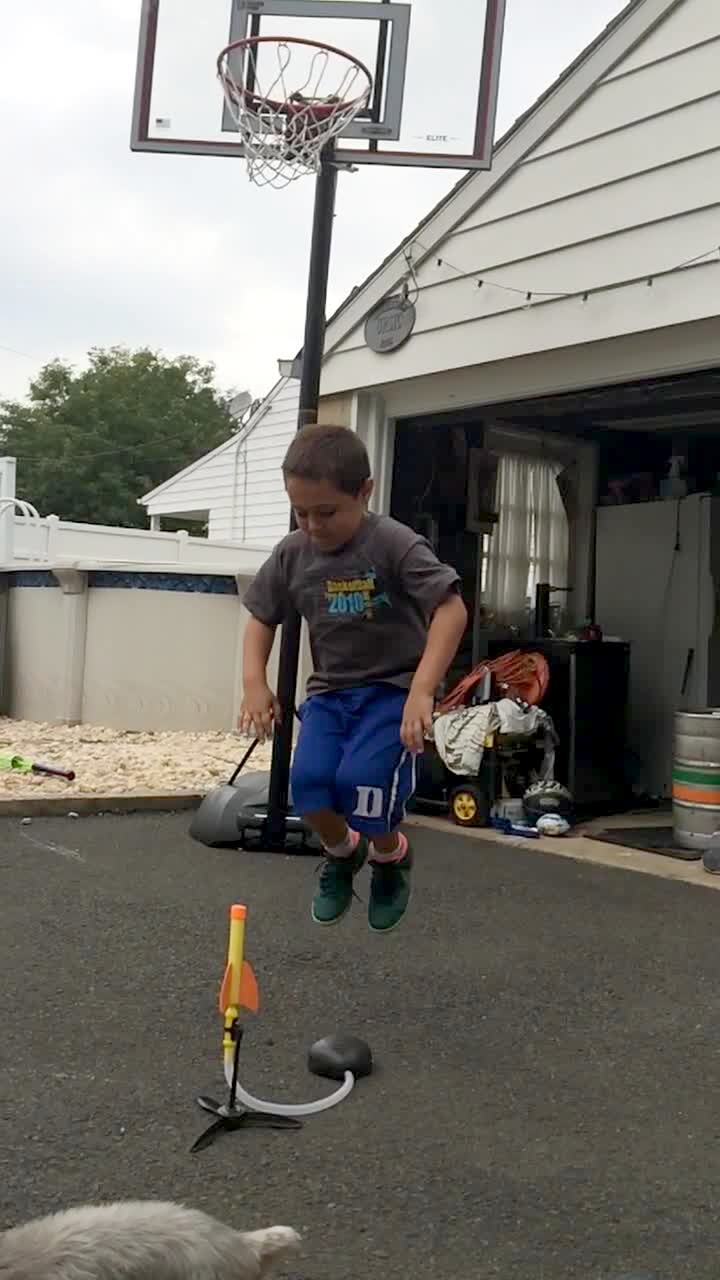 A boy jumps on a toy foot pump rocket launcher in slow motion in the driveway and the rocket shoots up and hits him in the face.