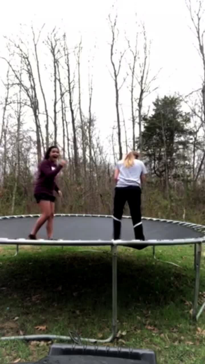 A teen boy and teen girl jump on a trampoline in a yard and the teen girl breaks through the trampoline and falls feet first down onto the grass.