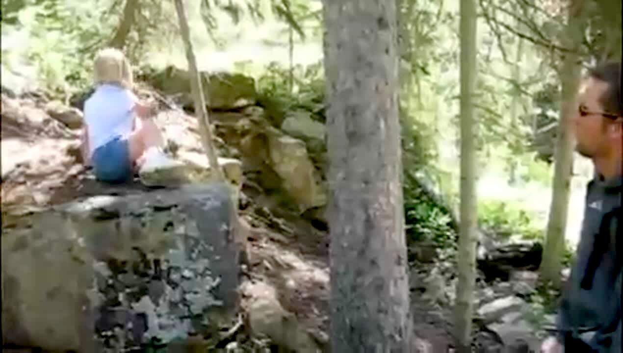 A girl scoots down a mountain jumps off a rock and into her dads arms, as he sets her down her older brother leaps off the rock expecting his dad to catch him but lands face first on the ground.