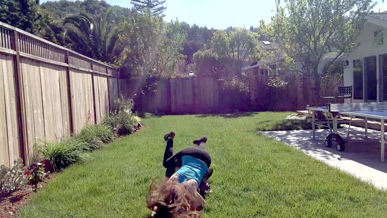 Boy and girl try a gymnastics trick outside, girl ends up falling on top of boy. Kids, boneheads
